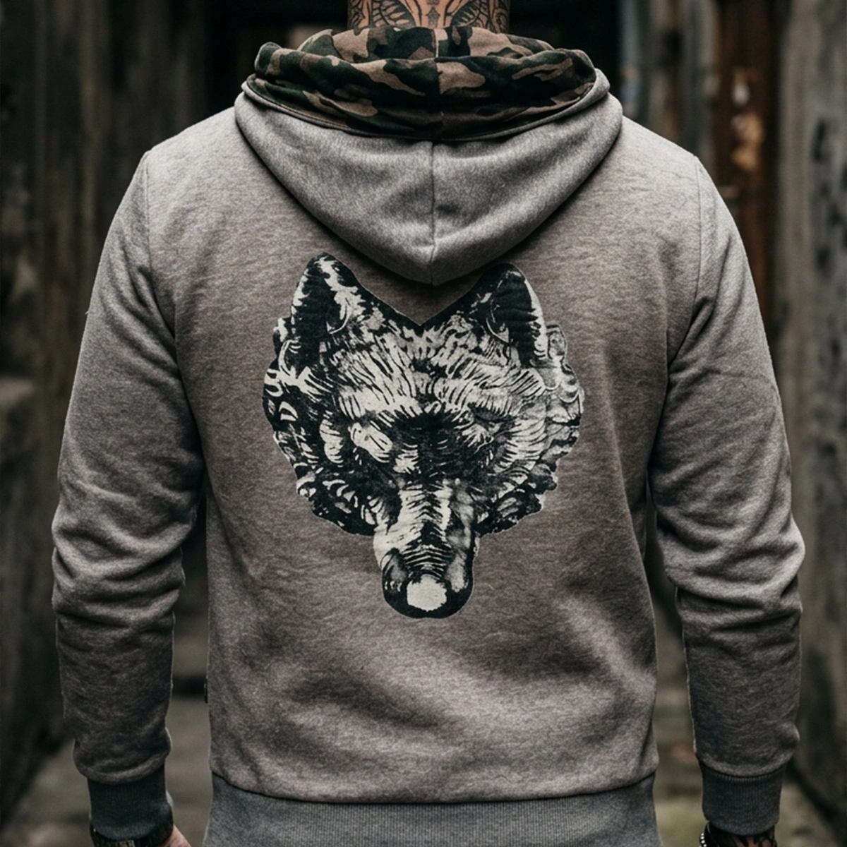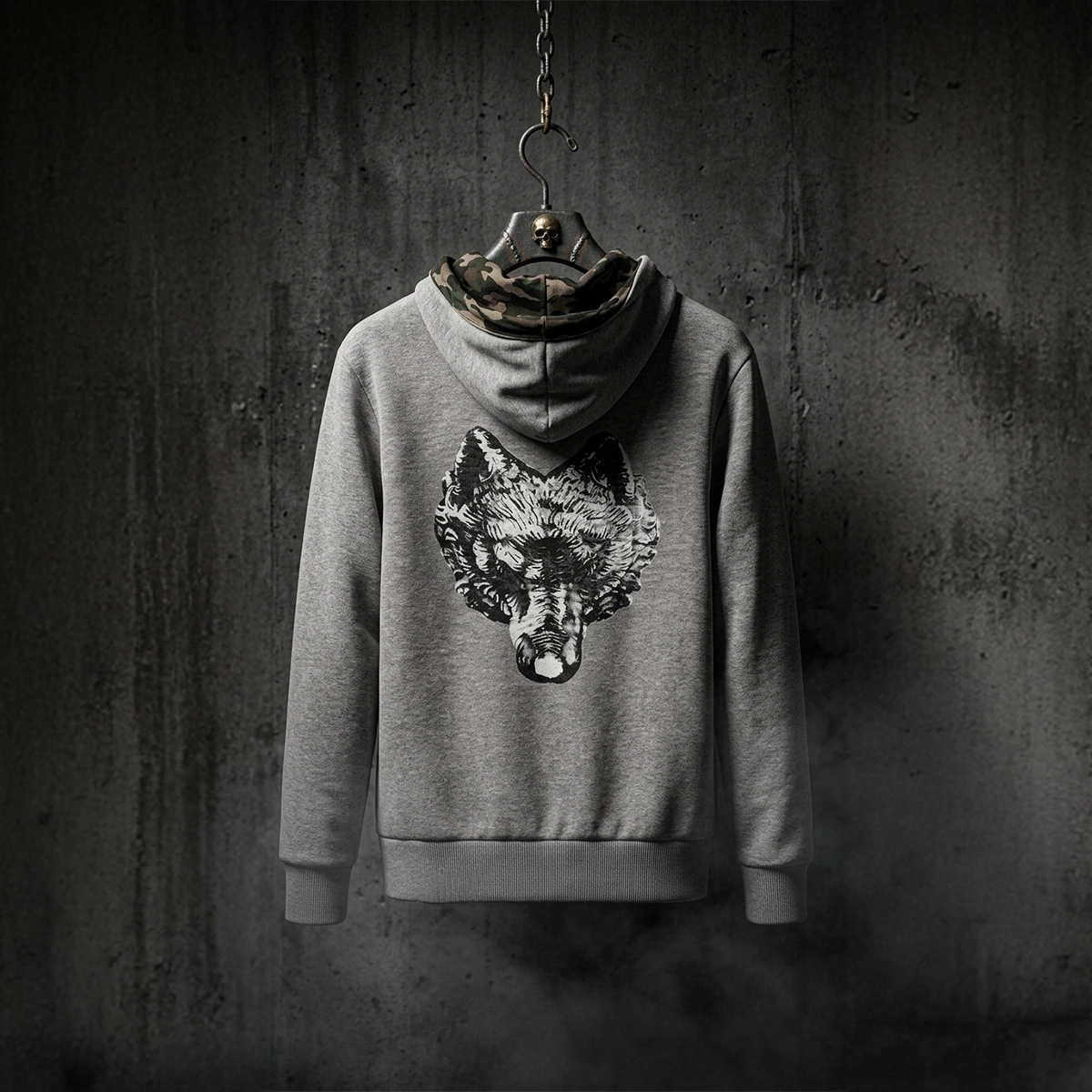 Arkası Kurt Başı Baskılı Kapüşonlu Gri Kamuflaj Sweatshirt