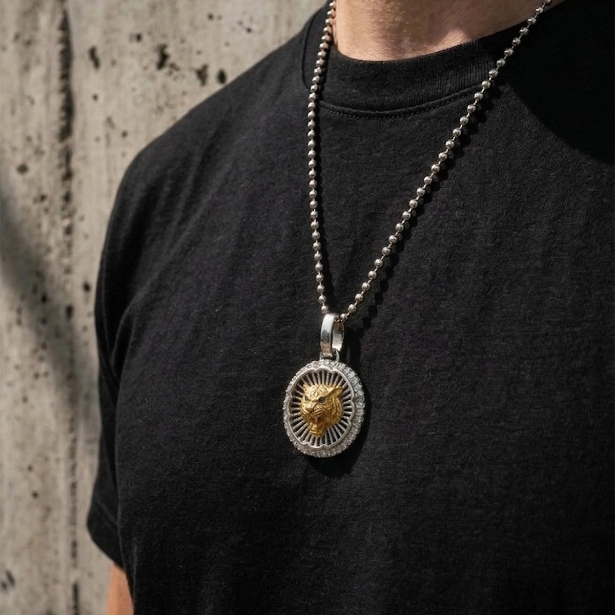 ZWEIFARBIGE KETTE IN FORM EINES DURCHBROCHENEN TIGERMEDAILLONS MIT STEINEN AN DEN RÄNDERN