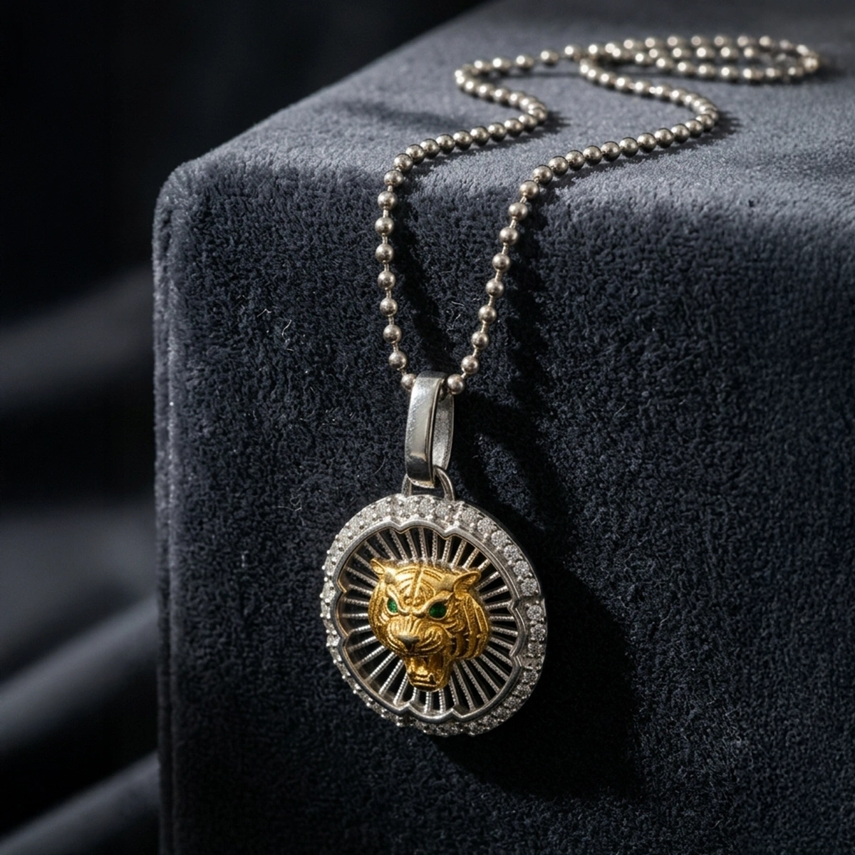 Zweifarbig plattierte Kette in Form eines durchbrochenen Tiger-Medaillons mit Steinbesatz