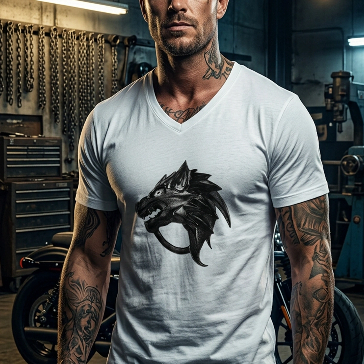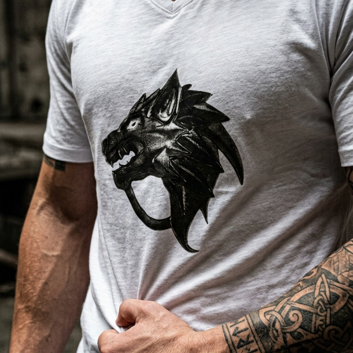 Ejderha Baskılı V Yaka Erkek Beyaz Tişört