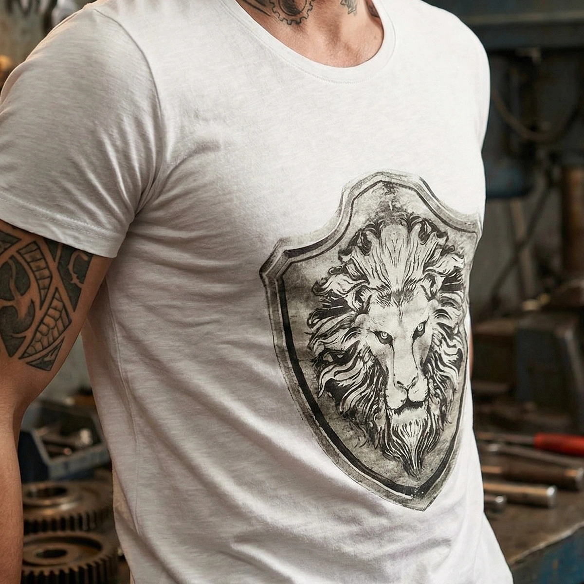 Special Design Lion Epaulet Printed Crew-Neck Men's White T-Shirt