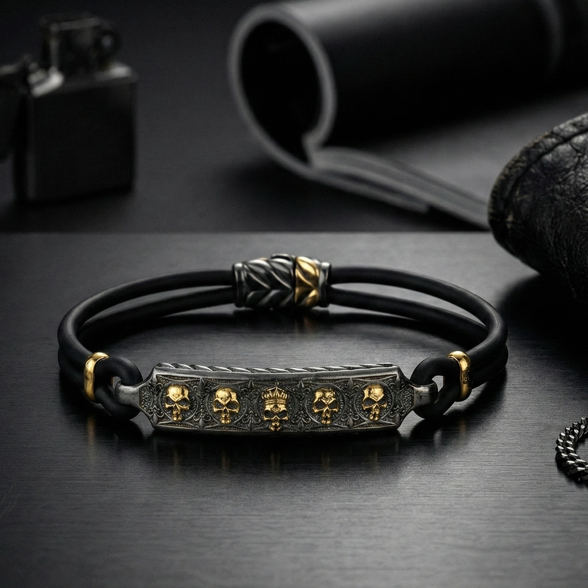 Her zaman ilgi çekeceğiniz kurukafa temalı kauçuklu 925 Ayar Gümüş Erkek Bilekliği