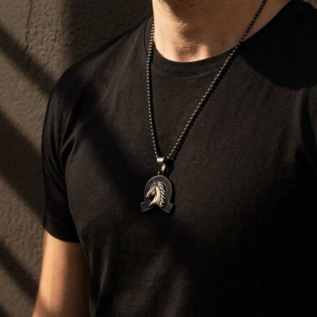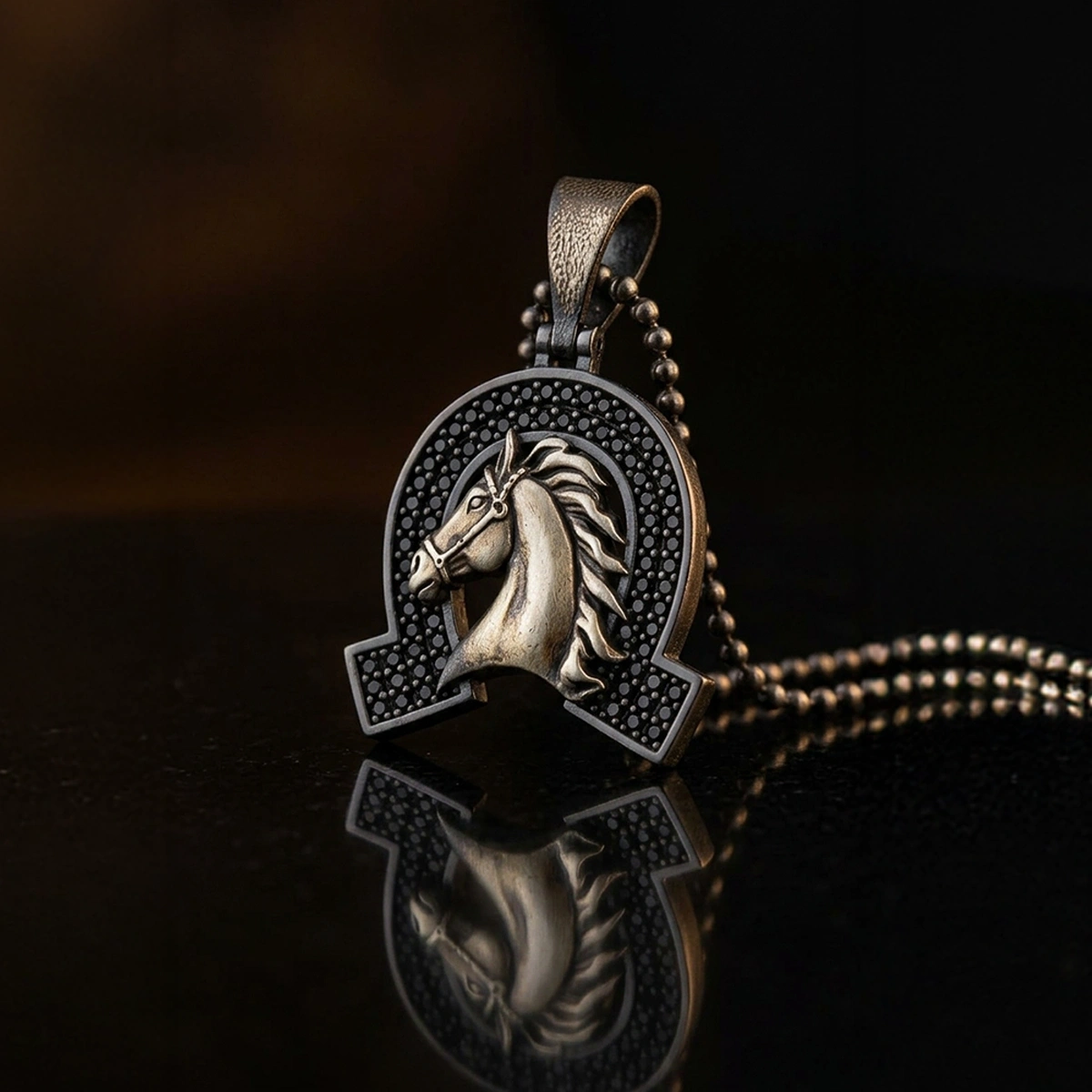 ÖZEL YÜZEY KAPLAMALI KENARLARI TAŞLI NALLI AT MADALYON KOLYE
